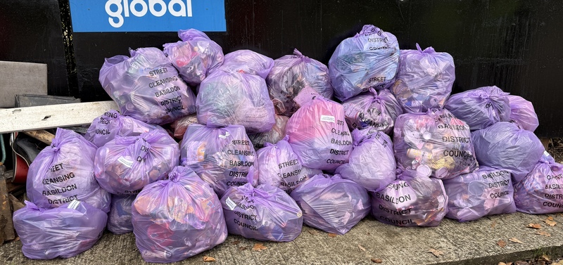 We picked around the Laindon Community Centre today and then down High Road, Laindon to the station, concentrating on the hedgerows and the steps leading down from either side of the railway bridge to the industrial estate; which were a mess! Afterwards teas & coffees provided by LCC for the pickers and home made rock cakes by my wife, Karen :-) In addition to the bags (which weighed about 60kgs) we collected loose wood, metal & plastic weighing about 15kgs, 81 glass bottles & jars, 2 nitrous oxide cylinders and 38 vapes..