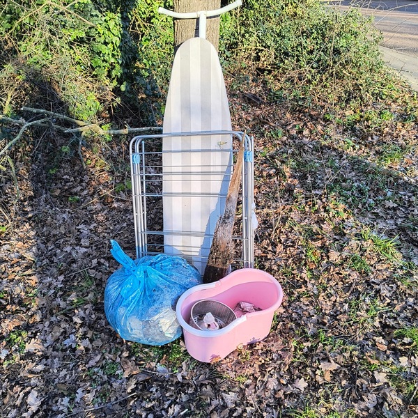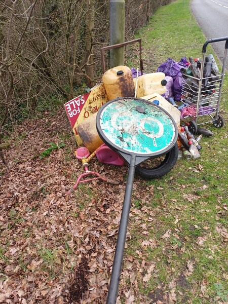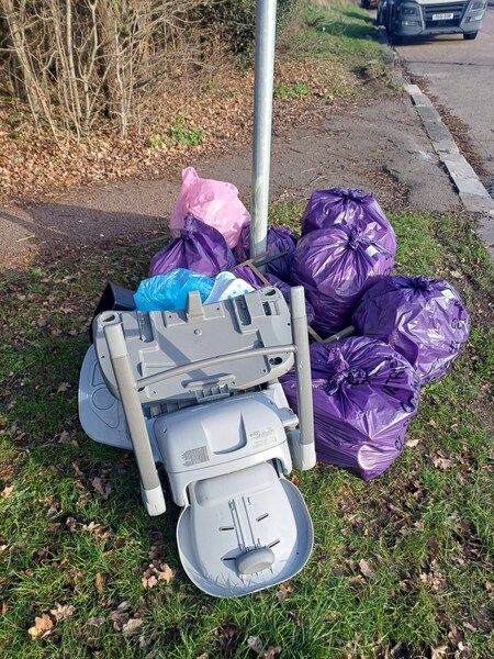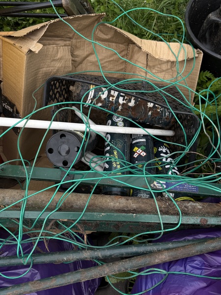 Noak Hill Road a small woodland verge near the bus stop and yellow crossing bollards (opposite Royston Avenue). A solo picking wombling adventure😮 - what was there? 7 purple litter sacks filled 2 nitrous oxide canisters Guttering pipe Metal stake A broom🧹 Plants in garden pots and empty plant pots🪴 Wooden fencing Bricks, concrete post pieces, rubble and paving slabs A garden gnome with handycart (oh mean wheelbarrow!) 😁 Recycled♻️ 4 glass bottles, 8 drinks cans and 3 plastic bottles The garden gnome (it was longways upsidedown so how did I find it under a tree🤔) made me laugh 🤣 loads and a very handsome boy robin flew around landing on branches of the trees ❤️🙂