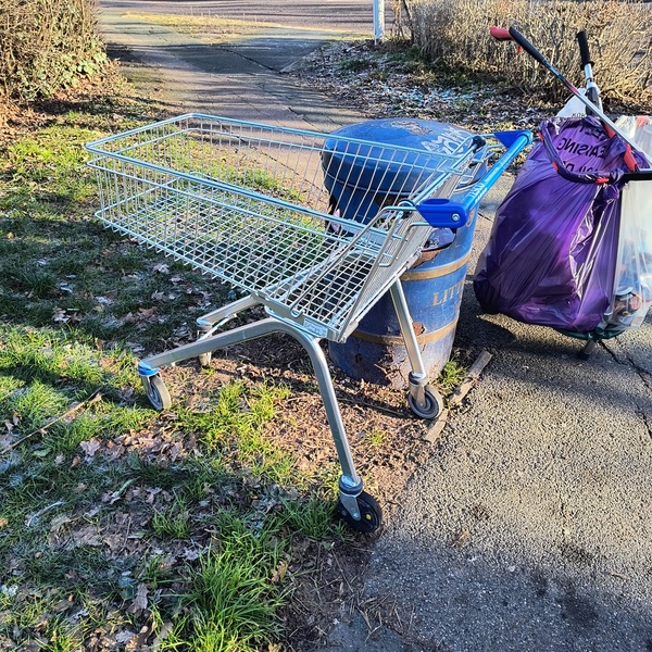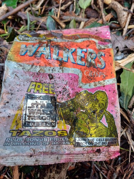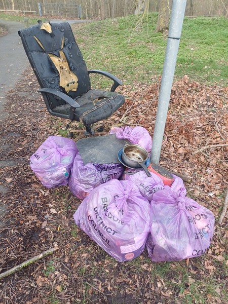 It is New Moon🌛 🐎 and time to go in the wood today. Thank you Diane Hurley for joining me at Oakley Path and Miles Gray Road. What was there? 6 purple litter sacks filled 1 black swivel office chair 1 Asda trolley (it became our recycling cart) A hose Signage A Snoopy tote bag and a black rucksack A saucepan, a dish and a frying pan (well it is Pancake Day 🍳😃) Recycled♻️: 75 glass bottles, 81 drinks cans, 14 plastic bottles and 6 vapes 😃
