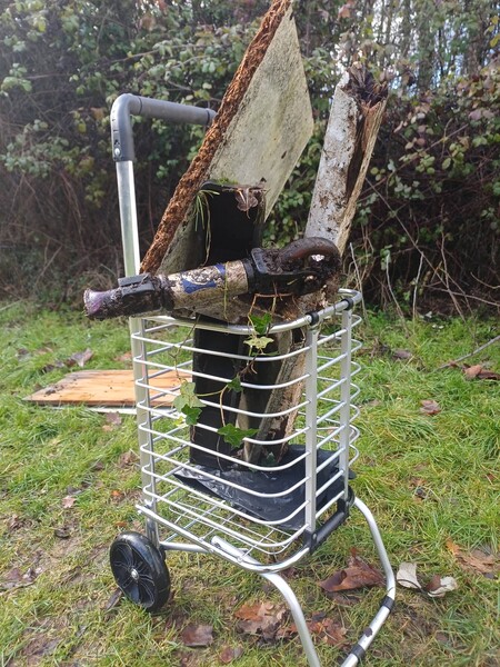 "If you go down to the woods today".. you'd better not go alone.. Thank you Ian for his biggest litter pick so far👏 with me today Where were we? Steeple View park and woodland. What was there? 11 purple litter sacks 1 white sack recycling ♻️ of 24 plastic bottles and 34 drinks cans A very large piece of wood, wooden low fencing and wood from cupboard door Childs scooter 🛴 Large black plastic nozzle from industrial hoover Long metal pipes Shopping basket A teddy bear 🐻 on his picnic