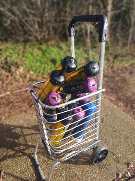 A colourful (Super!)Trolley (has anyone else seen the Amnesia Whip named nitrous oxide canisters🤔or is it just me!) Where was I? Oakley Path near Miles Gray Road What was there? 2 flytipped white sacks of household waste, a bath towel, a glass plate 2 long sleeved tops A debit card 17 nitrous oxide canisters and their cardboard boxes 😮 Recycled ♻️ 7 drinks cans 7 plastic bottles and 9 glass bottles 😃🐿