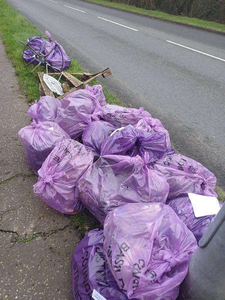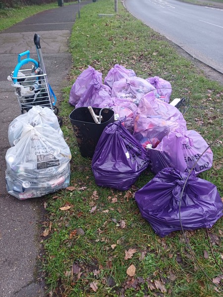 A Winter Womble in snow ❄️. Wearing my cosiest hood met Diane Hurley Ian and his cousin (an honorary Womble) in Steeple View. Luckily it stopped snowing after 20 minutes. Dianes Team picked High Road North both sides of Willowfield and Osier Drive filling 8 purple litter sacks 1 golf club⛳️ 4 vapes 25 glass bottles and 75 plastic bottles/drinks cans recycled♻️ 2 nitrous oxide canisters Meanwhile I went to Wash Road West adjacent to Doggy Field and into the layby opposite Blacksmith Forge in Dunton Road. Got into the hedgerow much to surprise of two passers by who were very grateful 🙂 and offered me a coffee☕️. This small area filled 3 purple litter sacks 1 tyre 6 plastic bottles and 25 drinks cans recycled ♻️ 16 nitrous oxide canisters. Had to get Supertrolley from car to move them! A BiG thank you to everyone in Team Womble today 🙂