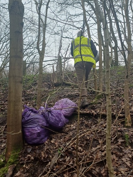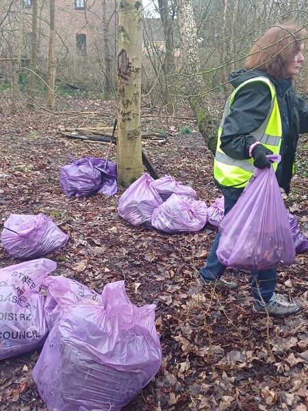 Not quite red sacks for Valentines Day ❤️ but squirrel 🐿 and fox 🦊 will LoVe their clean wooded glade now. Where were we? A wooded glade at the end of Steeple View Park at the bottom of a steep embankment in Hornbeam Way What was there? 21 purple litter sacks filled 1 nitrous oxide canister A metal table A metal ironing board Broken pallets and wood A sleeping bag in a black sack ♻️Recycled: 25 glass bottles, 1 vape, 24 plastic bottles and 18 drinks cans There were lots of very old plastic carrier bags in the earth today 😮 Ian was simply a star 🌟 getting the sacks and unbagged items up the steep embankment onto the pavement for collection 🚛 Valentines Day chocolates 🍫 to Diane Hurley today as well. Thank you both for joining me 😃