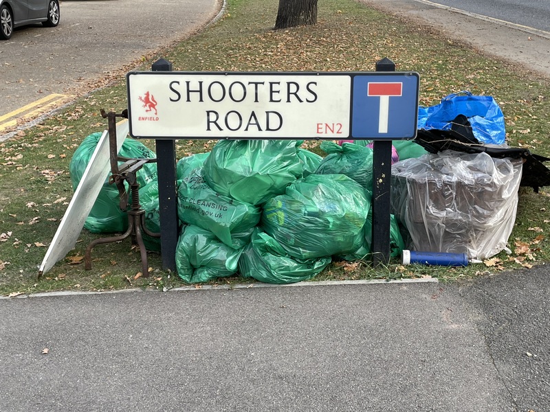 Upper Lavender Hill, and also covering Shooters Road, Comreddy Close, Albuhera Close, Hardy Way and Hunters Way. As well as our 14 bags, there were no,less than FIFTEEN Nitrous Oxide cylinders - obviously the party season has started! 🤡 There was also a fly tipped large TV package stuffed with rubbish - which was reported to Enfield Council street cleansing as had owner’s address still attached!