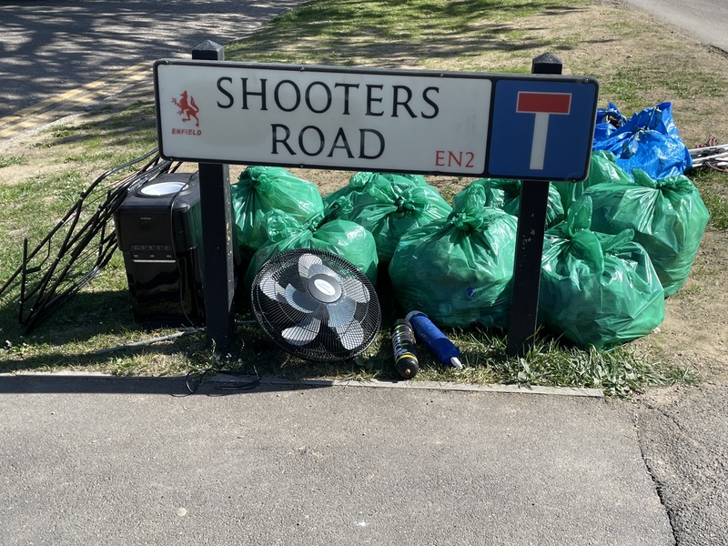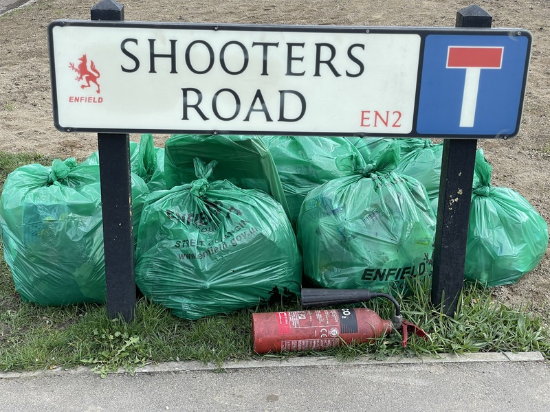 Thanks to our regulars Chris, Anil, Bobbie, Jasper (on his birthday!), and a special appearance from Christy. We collected 9 bags, part of a car bumper, an old road closure sign and a metal mop handle. As always the area at the top of Shooters Road where the car park for Chase Farm Silver Birches is situated was a hot spot. Well done Team! 👏