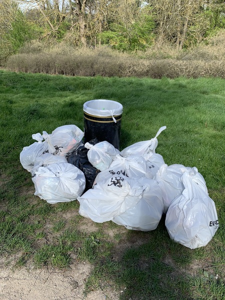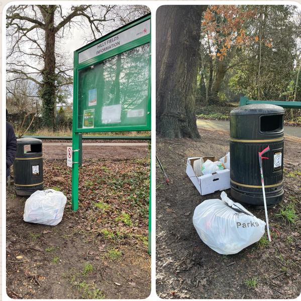Hillyfields Park walk/pick. One large bag, separated into recycling and rubbish into own bins at home. Plus one large bag found in the park and left by the depot on Cooks Hole Lane
